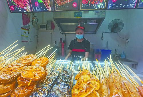 “初夏的晚上天氣涼爽,約朋友出來吃點(diǎn)夜宵,再在夜市散散步、逛逛街,感受熱鬧的煙火氣,很舒心!5月7日晚,走進(jìn)錦祥商業(yè)街,各種美食攤位已經(jīng)一字排開,市民李女士和朋友穿梭在人潮中,品嘗著炸串、烤魷魚、水果撈等各色美食。