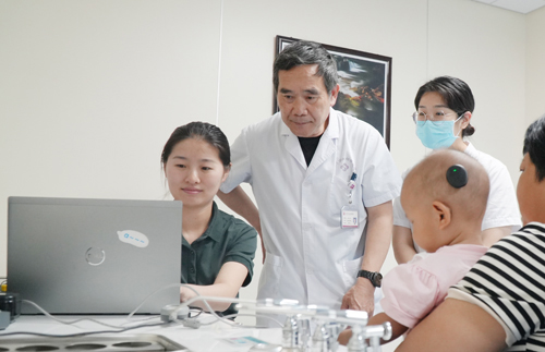 市婦幼保健院耳鼻喉咽科學(xué)術(shù)帶頭人鐘彥(左二)和技術(shù)人員為一歲寶寶進(jìn)行耳蝸電極測(cè)試。