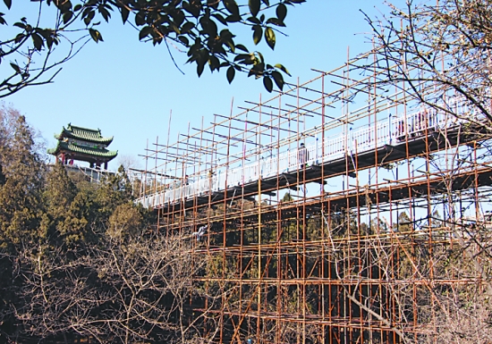 “橋頭兩座具有我國傳統建筑風格的塔樓已經成為人民公園的標志性建筑,所以保持原貌是此次改造首先考慮的因素。”趙永忠說。此次改造只拆除了原橋的主纜、主梁、橋面等部分,新橋利用了原橋塔和基礎部分,外觀上沒有根本變化。橋面在焊接完鋼板后,還將鋪一層厚2.5厘米的樟子松木面板,讓市民走上去仍然有老橋的感覺。